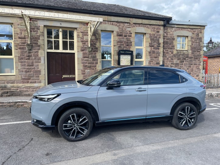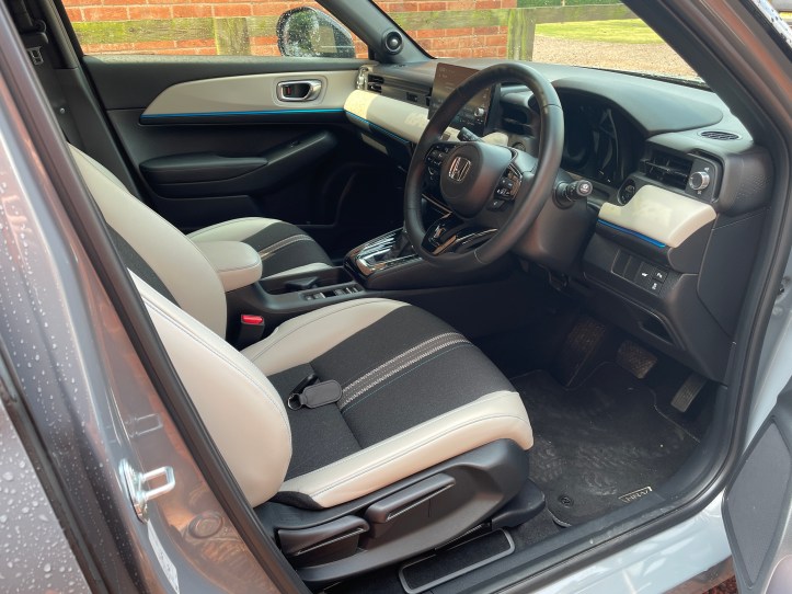 I then took unusual delight in following a ten-mile diversion to reach home and enjoy the £40k OTR HR-V. I can see why Honda owners love their cars. They are so easy to get to know and live with; the bikes are the same. I did smirk a bit when I grabbed the gear selector and had a flash-back to Longbridge-built Rover and Honda automatic 200/Concertos. The feel, the action, even the look was weirdly familiar. Not at all unpleasant, but quite functional and solid-feeling, controlling the e-CVT. I like CVT’s. The seat fabric is interesting and looks quality, providing a really unusual throne-like feel, yes, a pleasant place to be. Interior and exterior reflective blue flashes of trim highlights, plus familiar “very Honda” textures and well-fitted trim panels added to the perception of quality to the car.